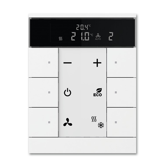 Fritt konfigurerbara multifunktions kontrollelement med RTC. Integrerad KNX-buss kopplare. Med märknings fält. Stöd för KNX-funktioner genom innovativt färg koncept (gult = belysning, blått = blind, orange = RTC, magenta = scen och vit = neutral/ingen funktion tilldelad) eller standardbelysning röd/grön.