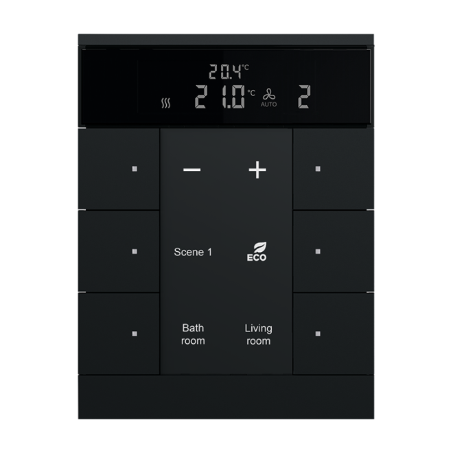 Fritt konfigurerbara multifunktions kontrollelement med RTC. Integrerad KNX-buss kopplare. Med märknings fält. Stöd för KNX-funktioner genom innovativt färg koncept (gult = belysning, blått = blind, orange = RTC, magenta = scen och vit = neutral/ingen funktion tilldelad) eller standardbelysning röd/grön.