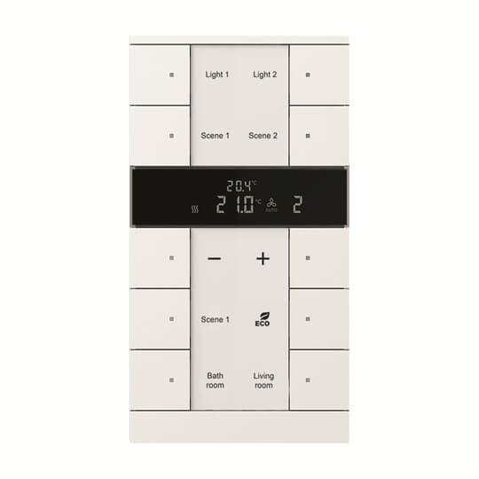 Fritt konfigurerbara multifunktions kontrollelement med RTC slav funktion. Integrerad KNX-buss kopplare. Med märknings fält. Stöd för KNX-funktioner genom innovativt färg koncept (gult = belysning, blått = blind, orange = RTC, magenta = scen och vit = neutral/ingen funktion tilldelad) eller standardbelysning röd/grön.