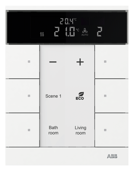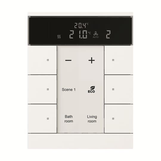 Fritt konfigurerbara multifunktions kontrollelement med RTC slav funktion. Integrerad KNX-buss kopplare. Med märknings fält. Stöd för KNX-funktioner genom innovativt färg koncept (gult = belysning, blått = blind, orange = RTC, magenta = scen och vit = neutral/ingen funktion tilldelad) eller standardbelysning röd/grön.