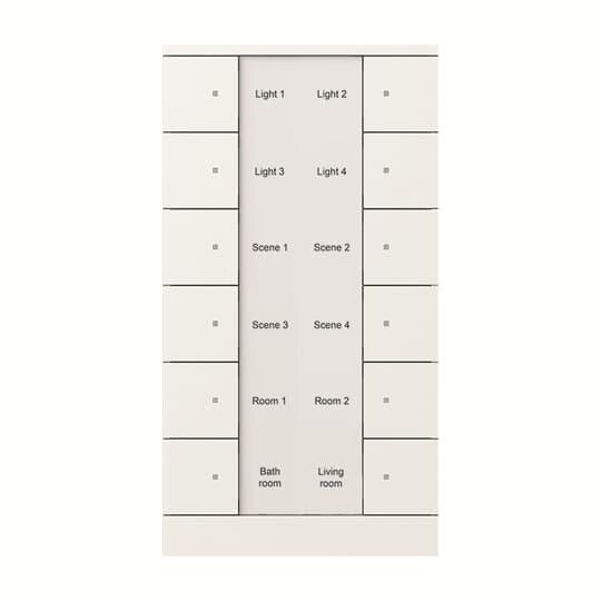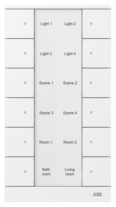Fritt konfigurerbara multifunktions kontrollelement. Med integrerad KNX-buss kopplare. Med märknings fält. Stöd för KNX-funktioner genom innovativt färg koncept (gult = belysning, blått = blind, orange = RTC, magenta = scen och vit = neutral/ingen funktion tilldelad) eller standardbelysning röd/grön.