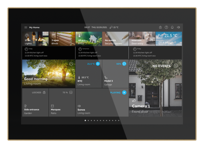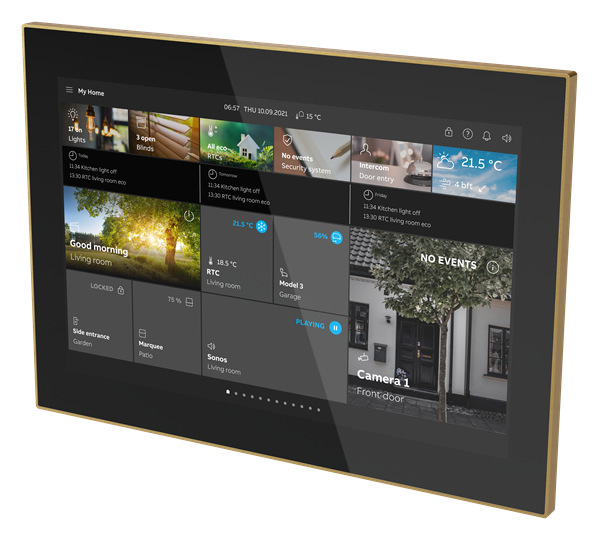 Fri programmerbar touch panel med en 10-tums IPS-skärm med 1280*800-upplösning som kombinerar smart hemautomation och dörrkommunikation i en enhet för bostäder, hotell och kommersiella byggnader. Smart Touch 10 erbjuder hemkontroll och övervakning av free@home eller KNX-systeme och de fullt integrerade funktionerna i ABB Welcome®. Kontrollera, observera och hantera hela din installation på en enhet: Omkoppling - Dimning - Sliders - Jalusi - RGBW-styrelement - Stegomkopplare - Scenomkopplare - Displayelement - Ljudstyrselement. Med scenfunktion, logiska funktioner, närvarosimulering och tidsprogram. Smart Touch® 10" kan också användas som slutenhet för kommunikation med ABB-Welcome utomhusstationer och som en del av ABB-Welcome dörrkommunikationssystem. Funktioner KNX: - Totalt 450 kontrollelement visas på högst 25 sidor. - 80 fel- och larmmeddelanden - 30 logiska funktioner - 30 timers - närvaro-simulering för 20 enheter - 10 scen aktorer - 1 intern RTC Utrustad med hörselslinga för att koppla in ljudsignalen i hörapparater. Sidvisning med högst 16 pekytor på en sida. free@home - free@home: Twisted pair-anslutning ger en enda sida med högst 18 reglage. Alternativt, för ytterligare kontroll, ger anslutning via wi-fi samma antal kontroller och funktioner som free@home-appen. Extern strömförsörjning: 20-32 VDC (SELV) eller via ABB-Welcome-systemets styrenhet. Displaystorlek: 25,4 cm (10"): Displayupplösning: (10,25 cm): 1280*800: Skärm: IPS-display Mått (L x B x D): (180,2 mm x 254,6 mm x 17,5 mm) Infälld eller väggmonterad, fäste för skrivbordsinstallation Den platta designen smal ram i äkta metall sitter nästan plant med väggen (14 mm) och finns i 4 färger (rostfritt stål, antracit, guld och roséguld) och svart eller vitt glas.