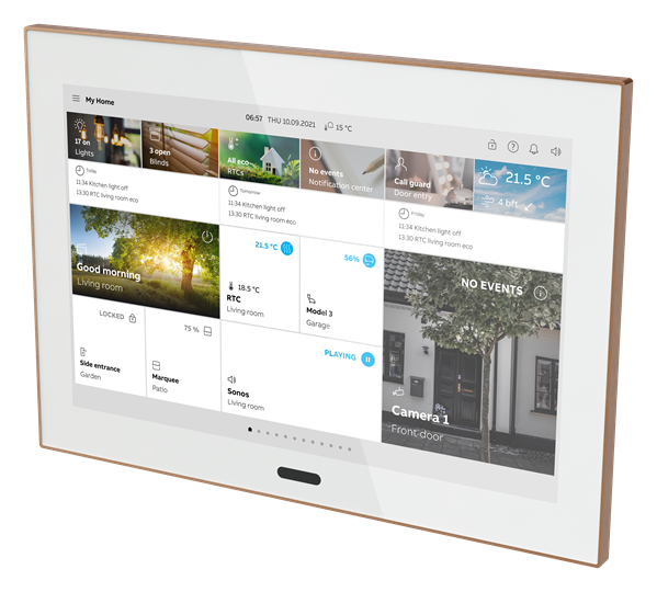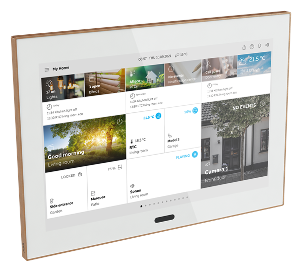 Fri programmerbar touch panel med en 10-tums IPS-skärm med 1280*800-upplösning som kombinerar smart hemautomation och dörrkommunikation i en enhet för bostäder, hotell och kommersiella byggnader. Smart Touch 10 erbjuder hemkontroll och övervakning av free@home eller KNX-systeme och de fullt integrerade funktionerna i ABB Welcome®. Kontrollera, observera och hantera hela din installation på en enhet: Omkoppling - Dimning - Sliders - Jalusi - RGBW-styrelement - Stegomkopplare - Scenomkopplare - Displayelement - Ljudstyrselement. Med scenfunktion, logiska funktioner, närvarosimulering och tidsprogram. Smart Touch® 10" kan också användas som slutenhet för kommunikation med ABB-Welcome utomhusstationer och som en del av ABB-Welcome dörrkommunikationssystem. Funktioner KNX: - Totalt 450 kontrollelement visas på högst 25 sidor. - 80 fel- och larmmeddelanden - 30 logiska funktioner - 30 timers - närvaro-simulering för 20 enheter - 10 scen aktorer - 1 intern RTC Utrustad med hörselslinga för att koppla in ljudsignalen i hörapparater. Sidvisning med högst 16 pekytor på en sida. free@home - free@home: Twisted pair-anslutning ger en enda sida med högst 18 reglage. Alternativt, för ytterligare kontroll, ger anslutning via wi-fi samma antal kontroller och funktioner som free@home-appen. Extern strömförsörjning: 20-32 VDC (SELV) eller via ABB-Welcome-systemets styrenhet. Displaystorlek: 25,4 cm (10"): Displayupplösning: (10,25 cm): 1280*800: Skärm: IPS-display Mått (L x B x D): (180,2 mm x 254,6 mm x 17,5 mm) Infälld eller väggmonterad, fäste för skrivbordsinstallation Den platta designen smal ram i äkta metall sitter nästan plant med väggen (14 mm) och finns i 4 färger (rostfritt stål, antracit, guld och roséguld) och svart eller vitt glas.