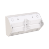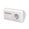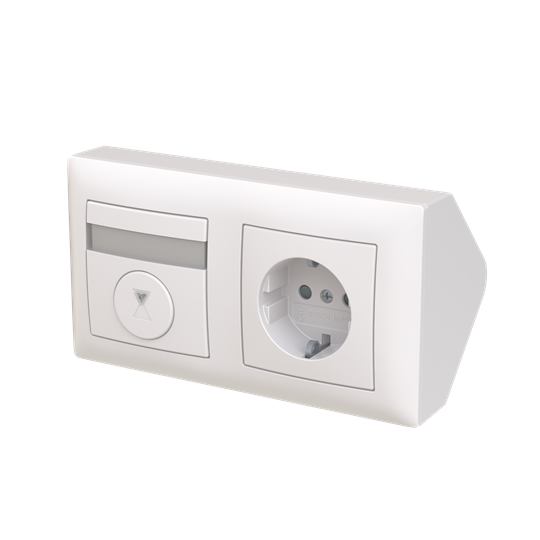 Timerset SAGA för hörn, innehåller timer, 1-vägs eluttag och installationshörnbox. Fasta tidsalternativ: 15 minuter, 30 minuter, 1 timme, 2 timmar, 4 timmar och 8 timmar. Utbytbara etiketter med tidsalternativ för att markera centrumplattan med vald tid. Biocirkulär plast används i bottenplattan.