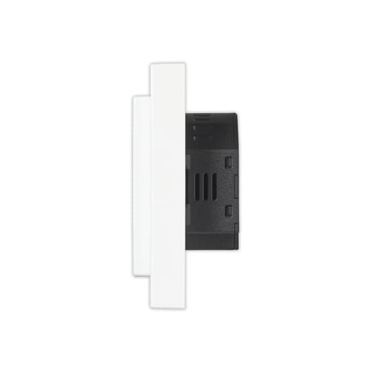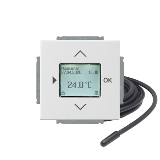 Termostat Impressivo vit med låg insats (20 mm monteringsdjup) som uppfyller kraven för ekodesign. Termostaten är förprogrammerad för enkel uppstart. Märkspänning 230V AC ± 10% 50 Hz.