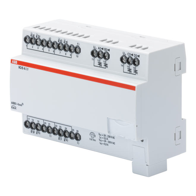 För styrning av värme-och kylapplikationer i rummet, såsom kylare, golvvärme eller kyla tak. Enheten har 4 kanaler vardera för den oberoende styrningen av en värme-eller kyl applikation. Varje kanal har en elektronisk ventil utgång för styrning av en termoelektriska ventil drift, samt 3 ingångar för att upptäcka och övervaka rummets status (Använd för fönsterkontakt, daggpunkt sensor, nivåsensor eller temperatursensor). Det är också möjligt att ansluta en analog rums kontrollenhet (SAR/A eller SAF/A) till ingångarna för varje kanal. Varje kanal har sin egen integrerade rumstemperatur regulator för kontroll av rumstemperatur, som kan användas direkt för att styra utgångarna på enheten. Enheten stödjer ABB i-Bus Tool för avancerad diagnostik och förbättrad driftsättning