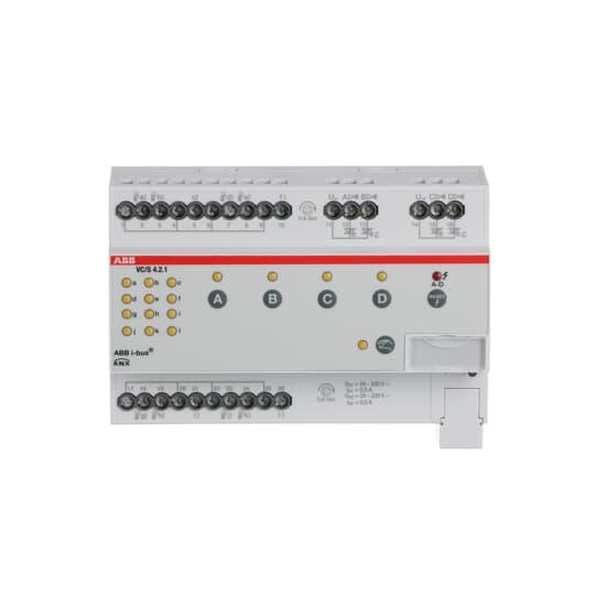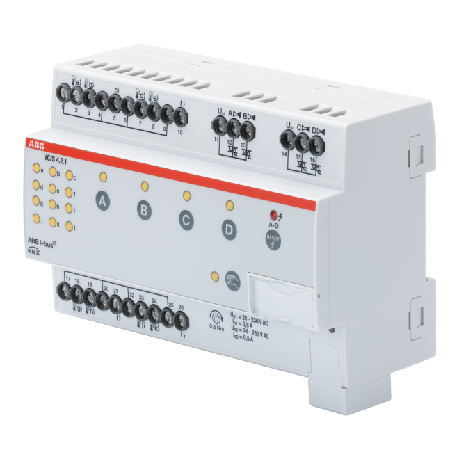 För styrning av värme-och kylapplikationer i rummet, såsom kylare, golvvärme eller kyla tak. Enheten har 4 kanaler vardera för den oberoende styrningen av en värme-eller kyl applikation. Varje kanal har en elektronisk ventil utgång för styrning av en termoelektriska ventil drift, samt 3 ingångar för att upptäcka och övervaka rummets status (Använd för fönsterkontakt, daggpunkt sensor, nivåsensor eller temperatursensor). Det är också möjligt att ansluta en analog rums kontrollenhet (SAR/A eller SAF/A) till ingångarna för varje kanal. Varje kanal har sin egen integrerade rumstemperatur regulator för kontroll av rumstemperatur, som kan användas direkt för att styra utgångarna på enheten. VC/S 4.2.1 har en lättanvänd manuell användning. Enheten stödjer ABB i-Bus Tool för avancerad diagnostik och förbättrad driftsättning