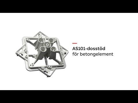 För varje position används två dos-stöd AS101. En ände, vänd neråt, stå på gjutbordet/alt är fäst med magnetmot gjutbordet (Gängad bussningsmagnet, "vemo-magnet", till exempel D60 / 65 H10, M16). I den andra änden, vänt uppåt, monterar man dosan (passar de flesta dosorna på marknaden). Dosstöden monteras ihop med två armeringsjärn 2 x Ø10mm eller 2 x Ø8mm. Längden på armeringsjärnen anpassas efter betongelementets tjocklek och av typen av dosa som skall gjutas in (separat diagram för dimensionering). Dosstödet är tillverkad av 100% återvunnen Polypropylen och är av halogenfritt material (IEC / 61249-2-21).
