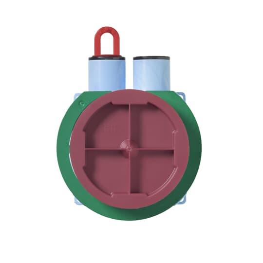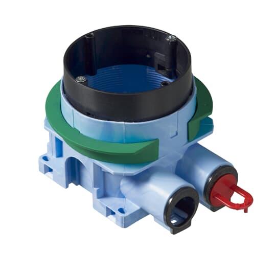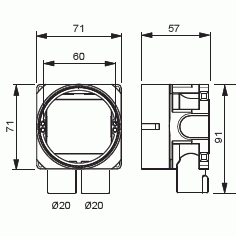 Apparatdosan är försedd med roterande monteringsring. Skruvavståndet är cc 60 mm. Den medföljande gröna distansringen används vid enkelgips (13 mm). Ringen avlägsnas när dosan monteras i dubbelgips (26 mm). Apparatdosan har två fasta stutsar för 16/20 mm rör av vilka den ena är öppnad. Dessutom finns fyra utbrytningar på sidorna och två i botten av dosan. Skruvavståndet är cc60 mm. Vid montage använd dosfräs T70 med diameter 74mm. Tillverkad av halogenfritt material och uppfyller glödtrådsprovets krav enligt standard IEC/EN60670:2005 (850° C). Dosan går att montera i brandklassade väggar EI30/EI60. Se instruktion.
